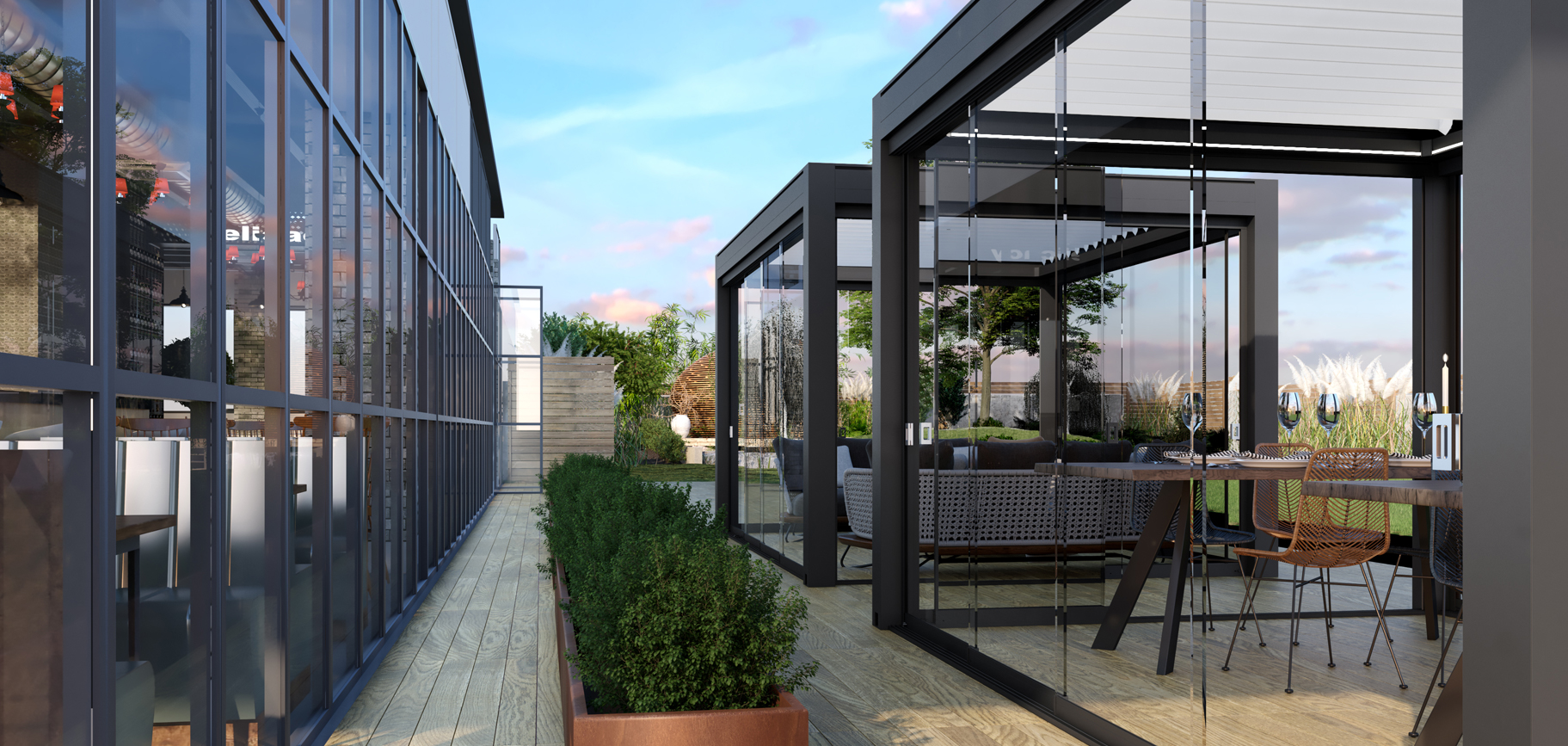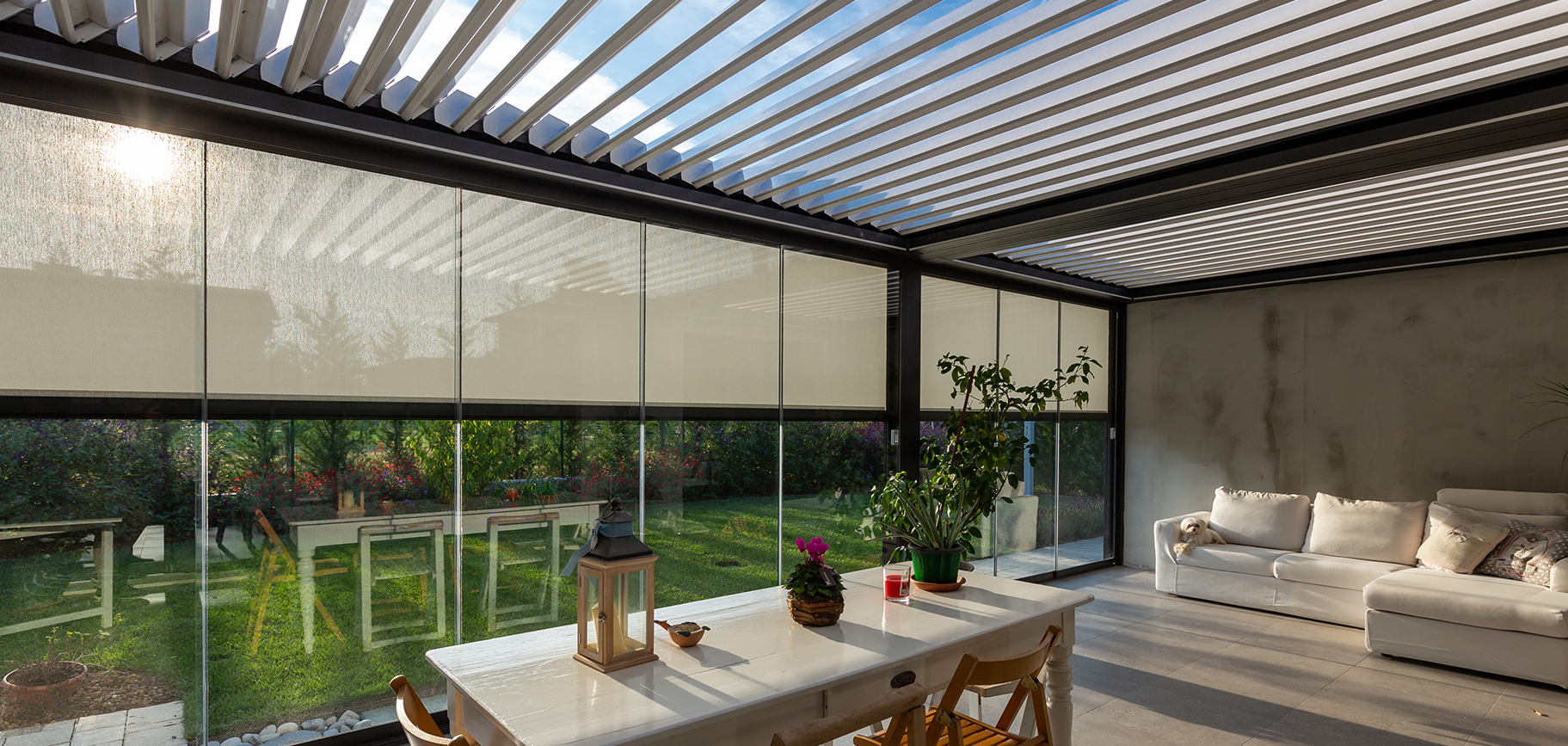 Vetrate scorrevoli con ante senza profili e guida a pavimento ridotta in altezza a soli 18mm. Di...