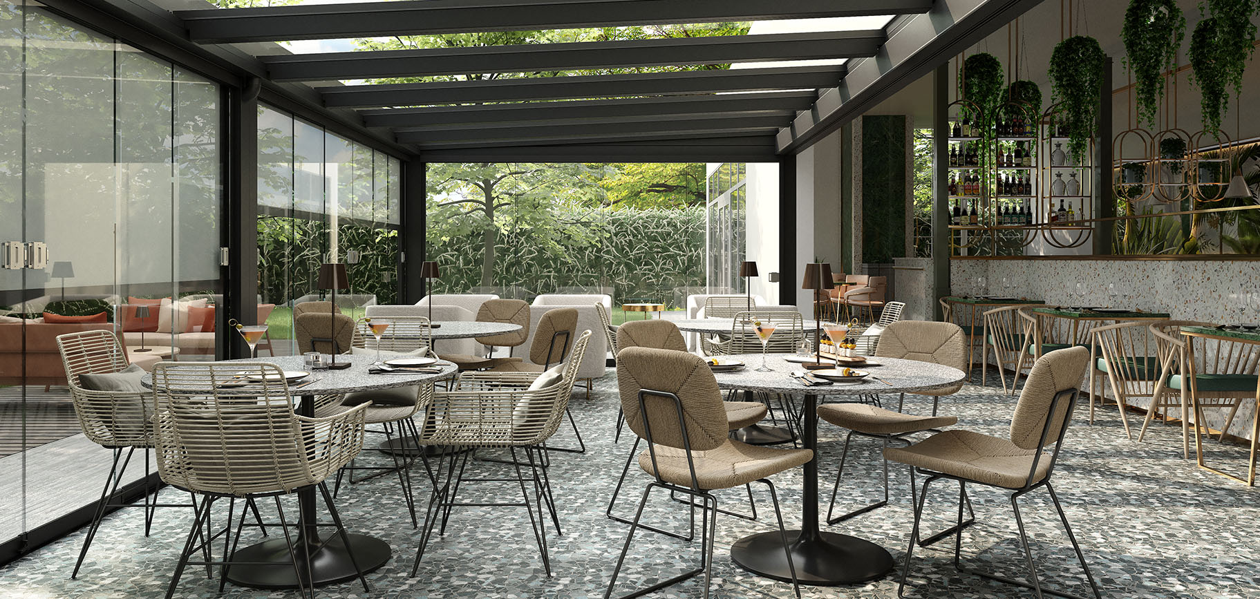 Possibilità di chiusura con tende tecniche verticali integrate, sistemi di vetrate scorrevoli e Roof tens per una schermatura sopra e sotto tetto