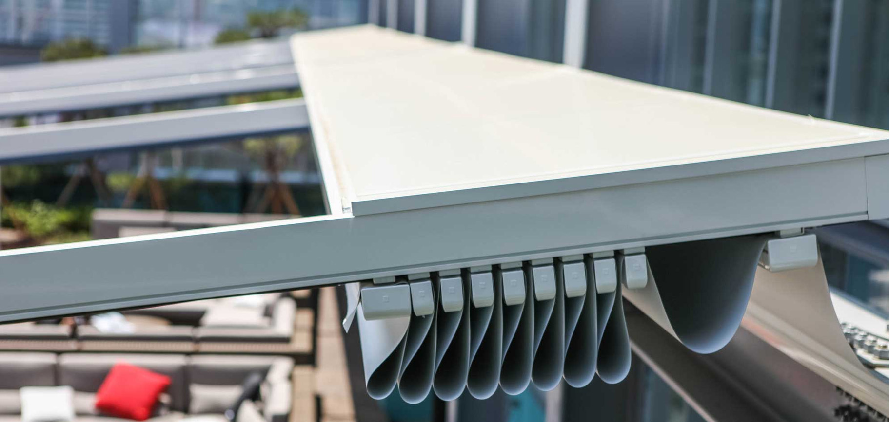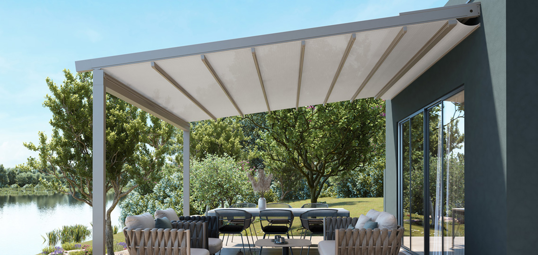 Pergolato in alluminio con copertura scorrevole ad impacchettamento con telo fissato ad un sistema di traversi, carrelli e guide che ne permettono lo scorrimento orizzontale.