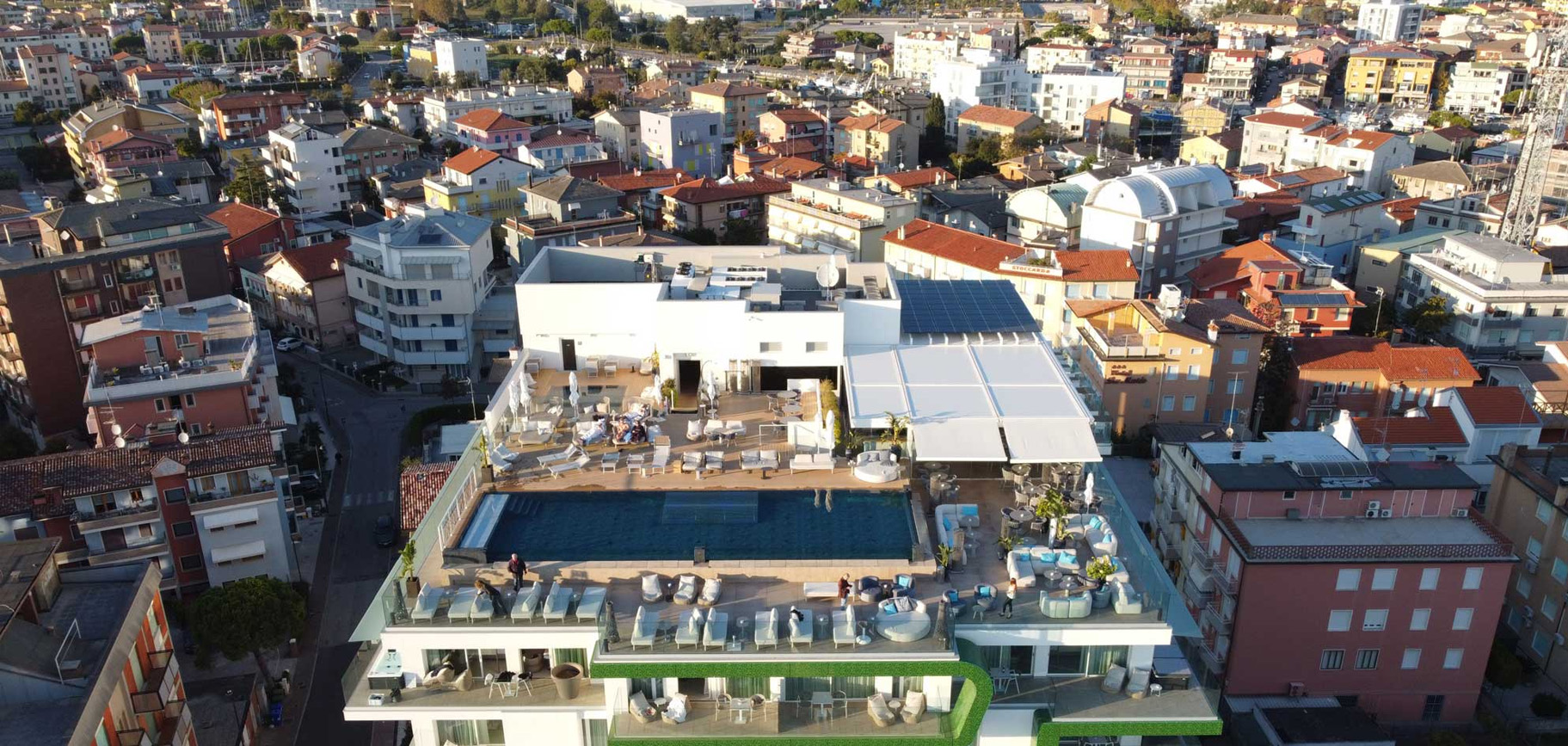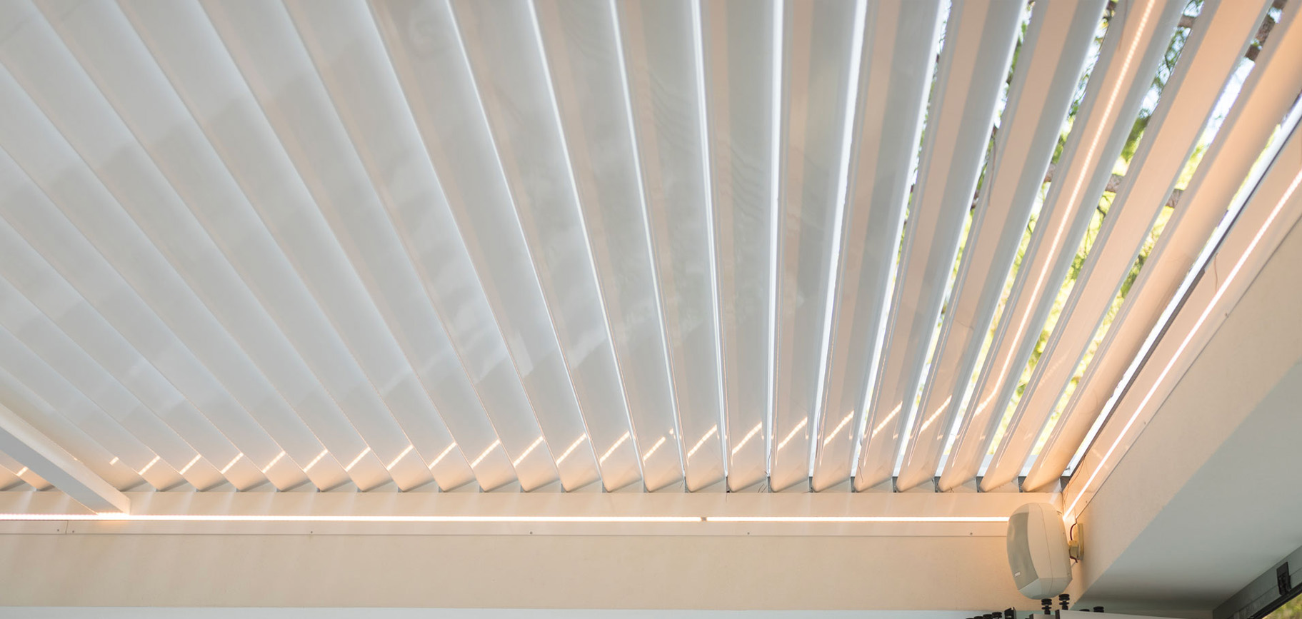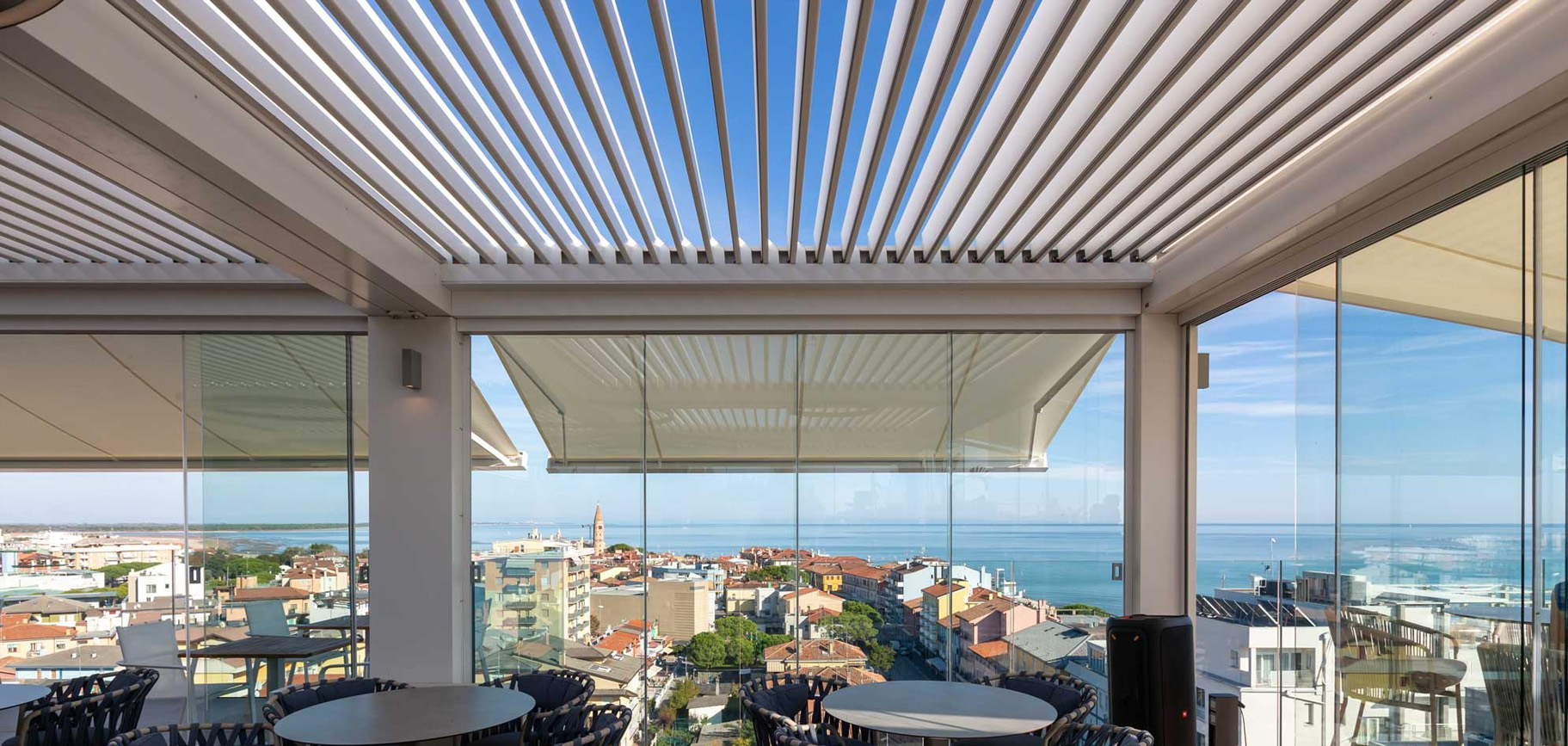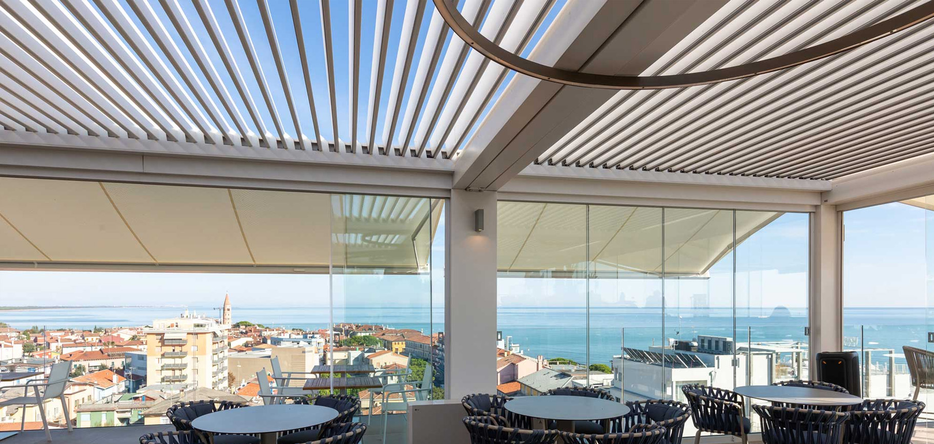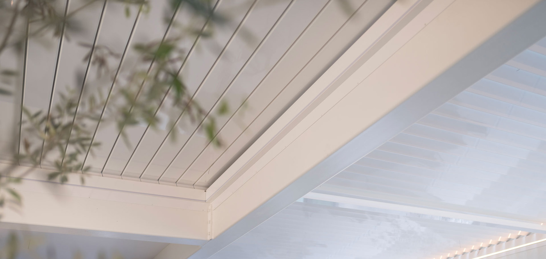 La tettoia bioclimatica in alluminio a lame orientabili composta da un profilo grondaia perimetrale che permette la rotazione delle lame e lo scarico dell’acqua.