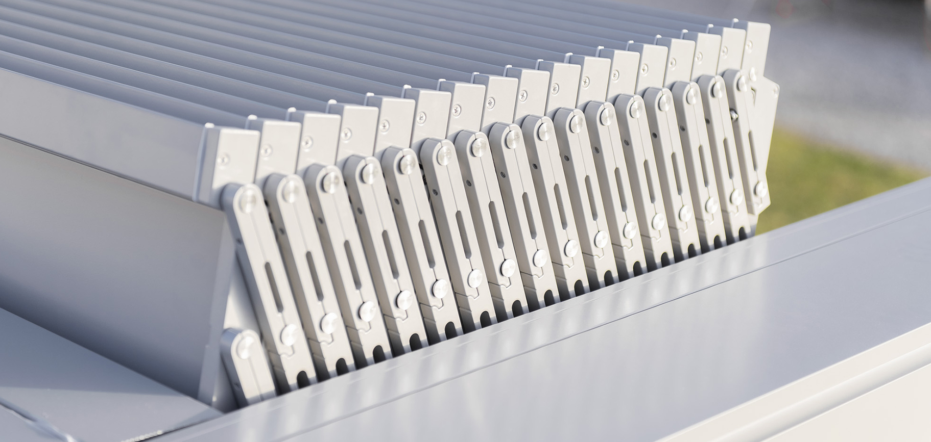 La novità principale di KEDRY SKYLIFE consiste nel tetto a lame mobili retrattili che permette di regolare l’intensità della luce e la ventilazione, in funzione delle condizioni meteo. Il sistema è innovativo: con un unico movimento le lame ruotano e arretrano, in apertura e chiusura, consentendo di esprimere al massimo il concetto di regolazione termica e luminosa.