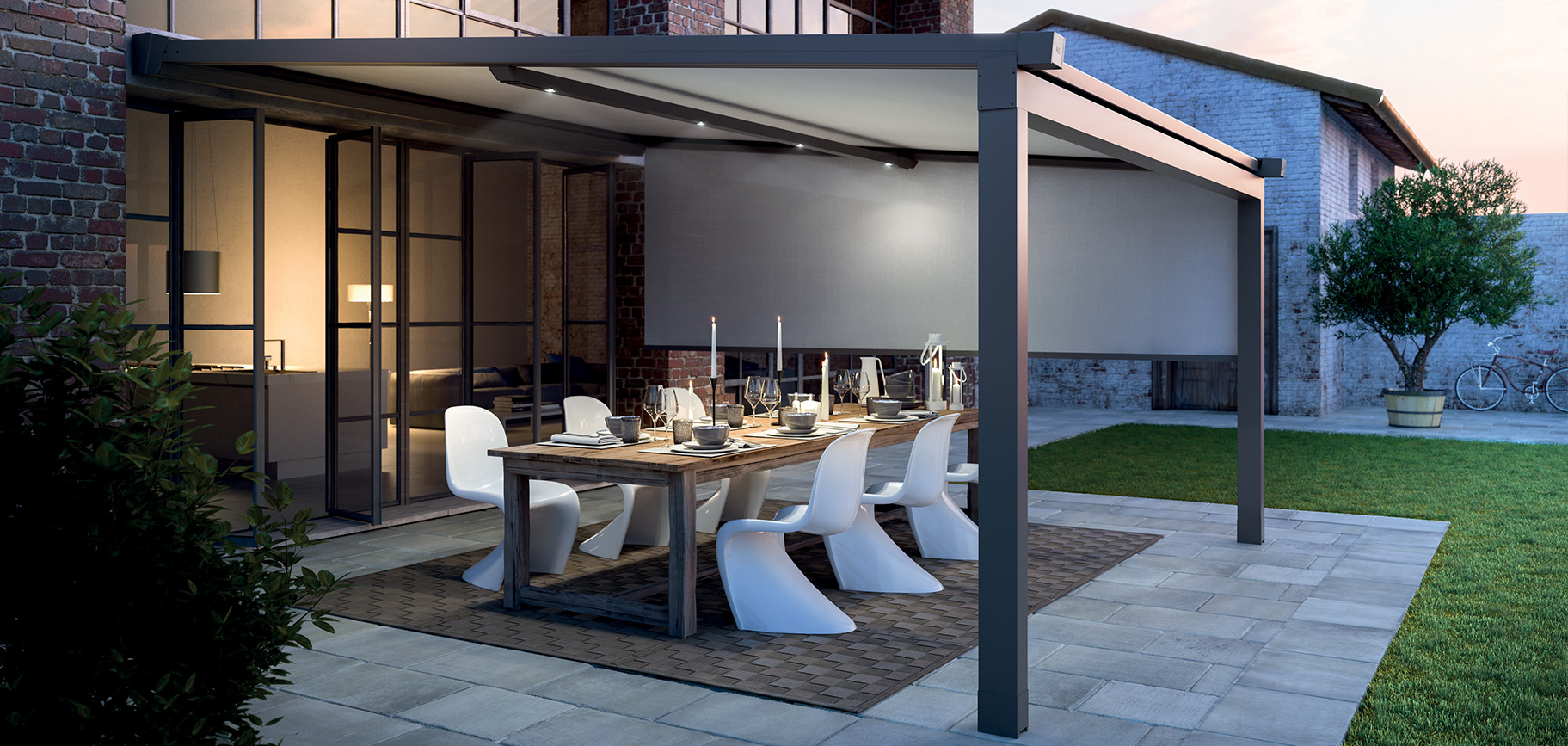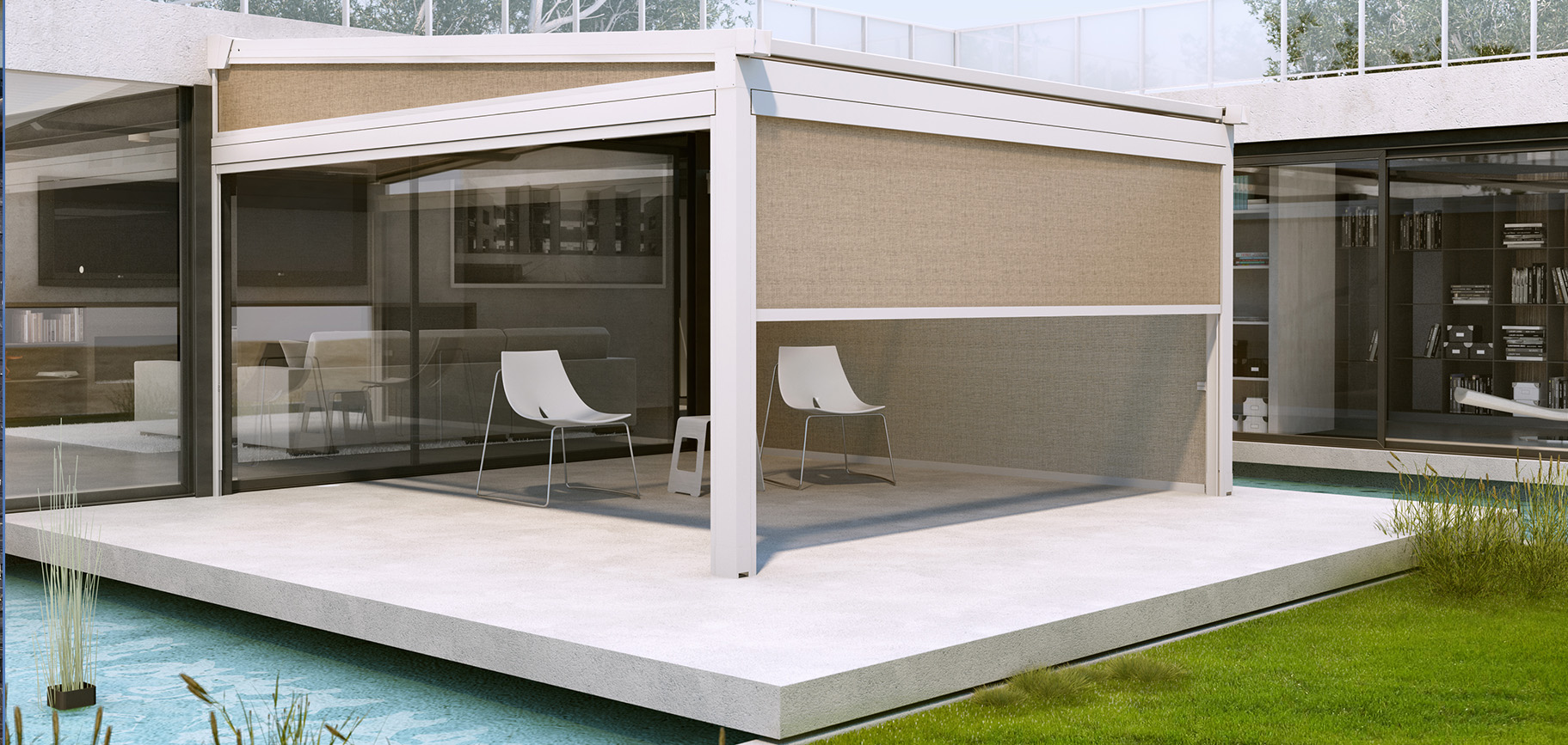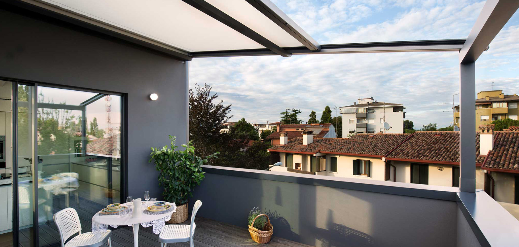Pergola con tenda scorrevole, tessuto ad arrotolamento anziché a pacchetto, si adatta ad essere installata anche in ambienti architettonici estremi, raggiungendo notevoli sporgenze con pendenze contenute.